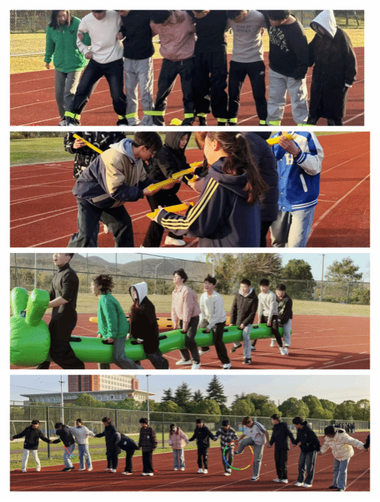 本次活动共设置了“毛毛虫竞速”“八人九足”“能量传递”和“一圈到底”4个趣味运动游戏,集趣味性、教育性、运动性于一体。这些项目不仅考验了同学们合作意识和团结互助精神,也考验了学生个人敏捷能力、耐力、速度和平衡协调能力等方面。“毛毛虫竞速”要求参与的同学成为一个整体,把自己视为团队中的一员,通过调整自己的节奏,适应团体的步伐;“八人九足”让同学们在配合中增进对彼此的了解,通过沟通和反思学会合作;“能量传递”“一圈到底”以接力的形式进行,既考验个人的速度和反应力,也让参与的同学在合作过程中增强对“团队”的认同,增进对团队成员的理解和接纳。
