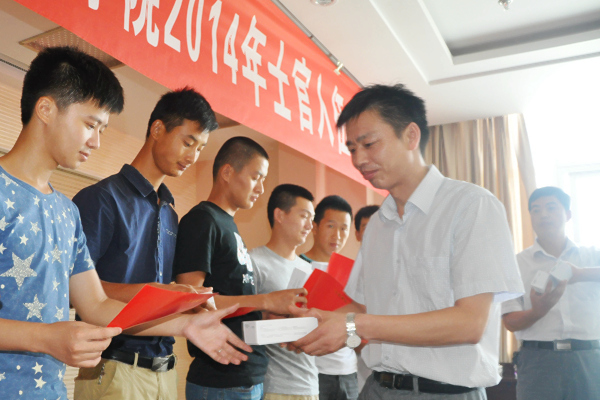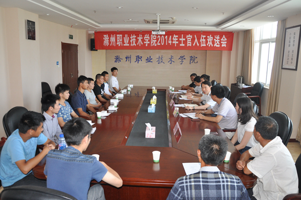 8月5日上午,beat365中国唯一官方网站2014届直招士官入伍欢送会在904会议室举行,院党委书记张勇,党委委员、副院长汪上,学生处长李平权、学生处耿学刚老师、辅导员代表赵纯老师和学生家长代表等出席欢送会,金天宇、蒋增庚、沈金洲、张风雷、袁超、沈参政、李鹏飞、夏康等8名2014年直招士官入伍同学参加会议并领取入伍通知书。