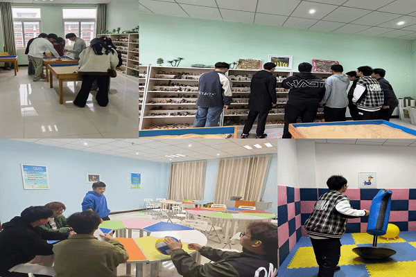 在大学生心理健康教育中心,同学们兴致勃勃地参观了预约接待室、个体咨询室、宣泄室、音乐治疗室、团体辅导室和沙盘室等多个功能室。通过老师细致入微的讲解,同学们了解了心理健康中心的工作定位和理念,熟悉了心理咨询的流程和预约方式。