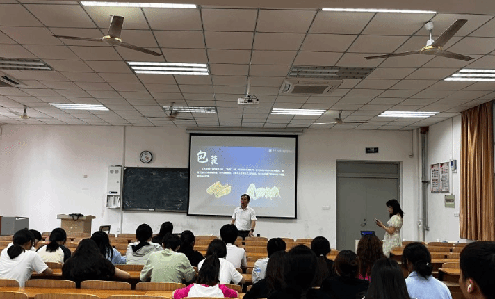 6月19日下午,食环学院在南阶103教室开展“大师进校园 名师进课堂”活动,绿色食品生产技术专业省级产业教授、昇兴(安徽)包装有限公司总经理吴剑佳应邀为同学们作报告,食环学院食品专业教师和学生代表参加了此次讲座。