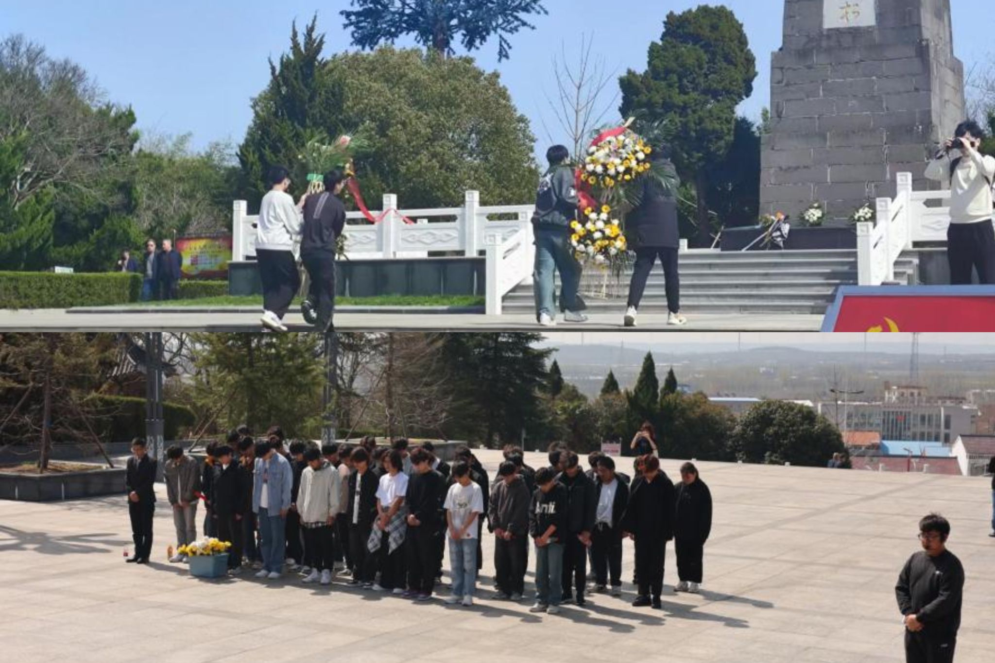 到达半塔保卫战旧址,同学们抬着花篮,缓步走向纪念碑,将花篮安放在纪念碑前。敬献花篮后,全体同学向烈士纪念碑行鞠躬礼,向烈士默哀。