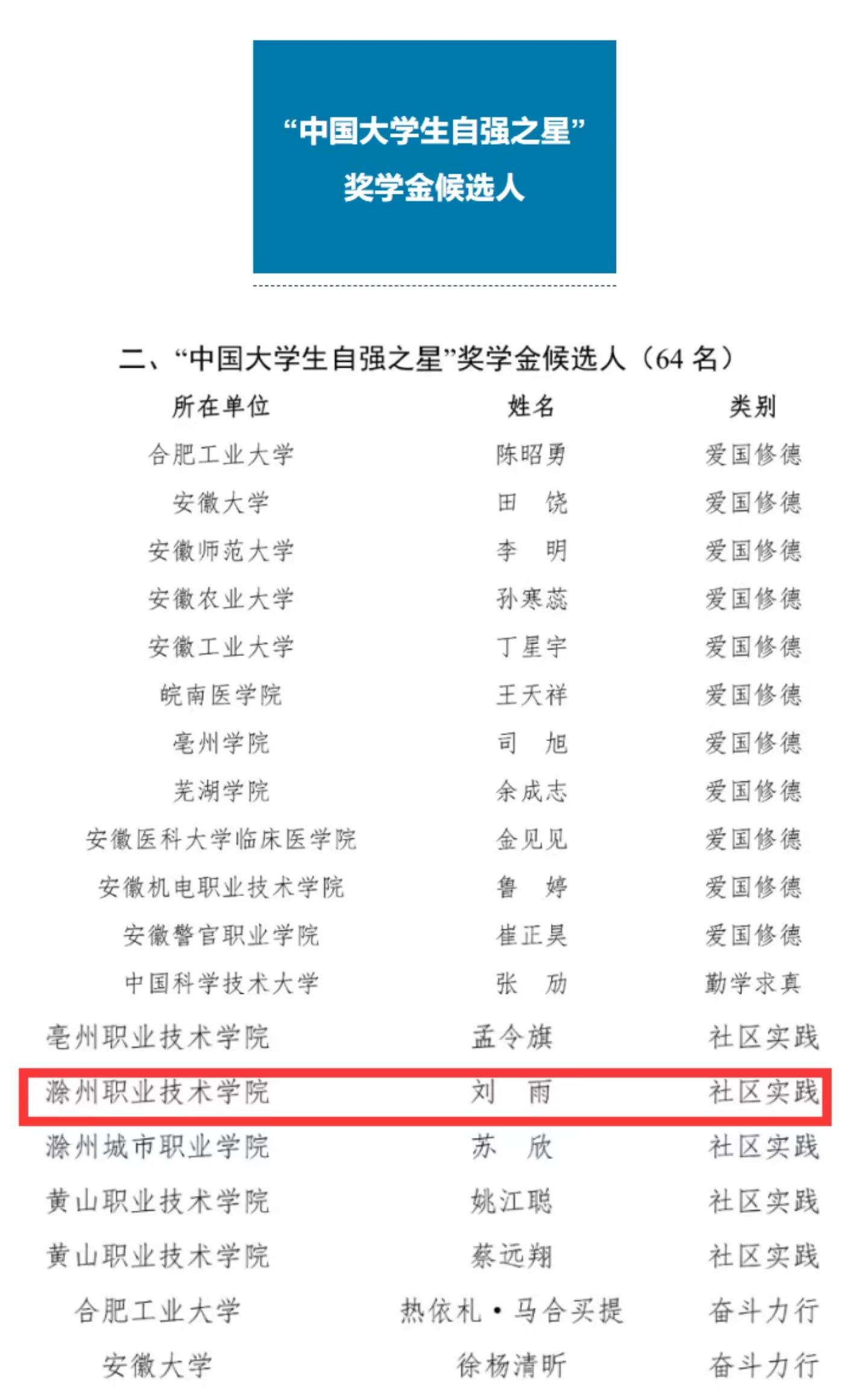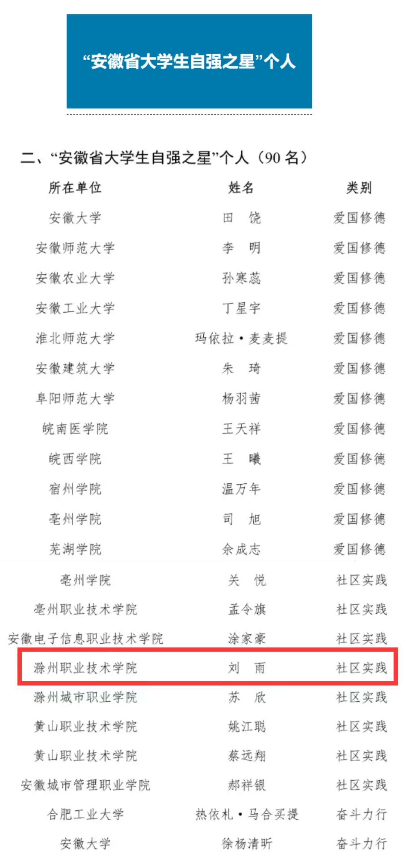 近日,共青团安徽省委学校部、安徽省学生联合会秘书处联合发布2023-2024年度“安徽省大学生自强之星”获得者及“中国大学生自强之星”奖学金推荐候选人。365官网学子刘雨荣获“安徽省大学生自强之星”称号,并被推荐为“中国大学生自强之星”奖学金候选人。