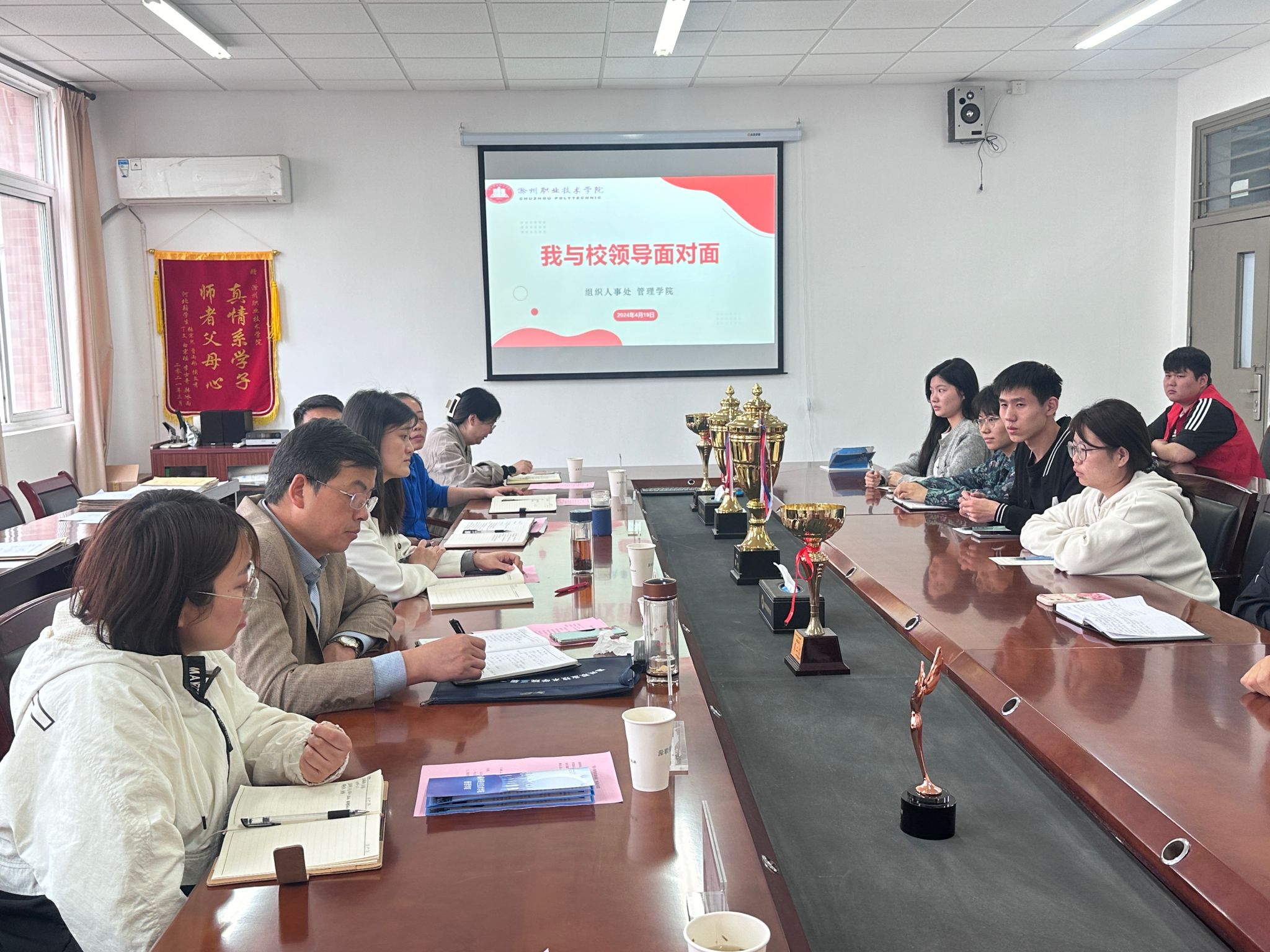 为进一步推进“双高校”建设,提升学校内涵建设,促进学院工作全面高质量完成,4月19日上午,组织人事处与管理学院在1405会议室开展“我与校领导面对面”交流活动。校党委委员、组织人事处处长王宇、校团委书记甄帅、管理学院党总支书记耿学刚、党总支副书记何文婧、团总支书记袁一、辅导员代表丁晓宇、组织人事处周彤参加此次活动。活动由耿学刚主持。