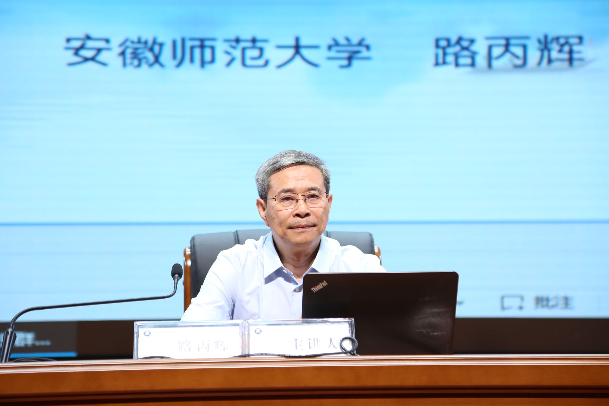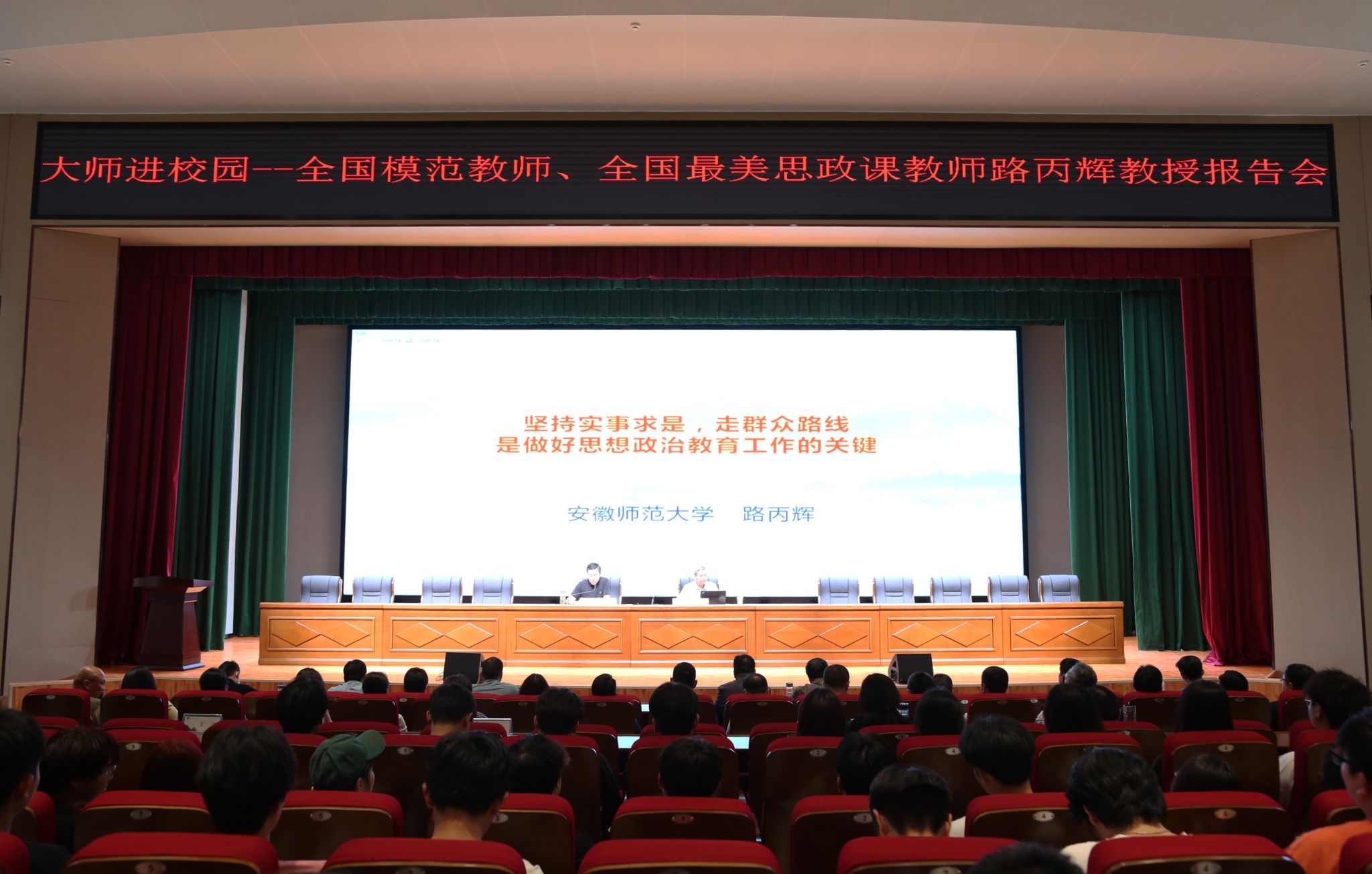 正值全校上下深入学习习近平总书记对学校思政课建设作出的重要指示精神之际。为加强学校党建工作,提升思政工作建设质效,落实立德树人根本任务,助推“双高校”建设,5月14日下午,全国优秀共产党员、全国模范教师、全国师德标兵、全国最美思政课教师、党的二十大代表安徽师范大学路丙辉教授应邀来校作 “坚持实事求是,走群众路线,是做好思想政治教育工作的关键”主题讲座。讲座在6号实训楼一楼报告厅举行,校党委副书记杨家庆主持讲座,党委委员、纪委书记孙静,党委委员、宣传统战部部长王冬出席。各教学院部党政正副职,各部门正副职,全体专兼职思政课教师、辅导员,学生工作处、团委等部门人员参加,全校各班级思政委员现场聆听讲座。