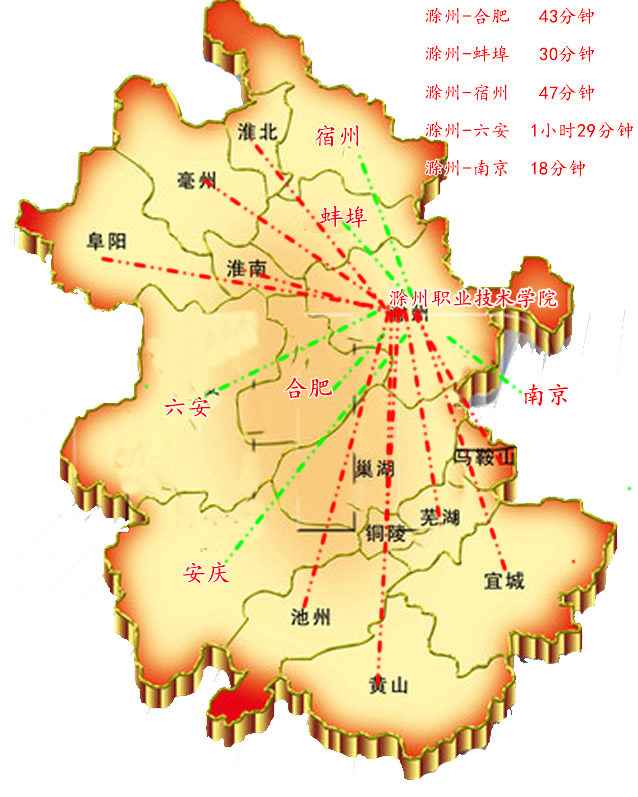 滁州地处皖东,是安徽的东大门,毗邻长三角。滁州素称“金陵锁钥,江淮屏障”,东南与江苏南京、扬州相连,西北与合肥、蚌埠交界,下辖两市两区四县。京沪高铁、沪汉蓉高铁、京沪铁路、宁西铁路穿城而过,沪陕高速、宁洛高速、马滁扬高速直通市域,形成承南启北、连接东西的立体交通网络。滁州站作为京沪高铁江北第一站,到北京、上海分别只需三个半小时和一个半小时。南京城市发展战略中,规划有轻轨、城际铁路等14条快捷通道连接滁州。市内驱车一小时可达南京禄口机场和合肥新桥机场。