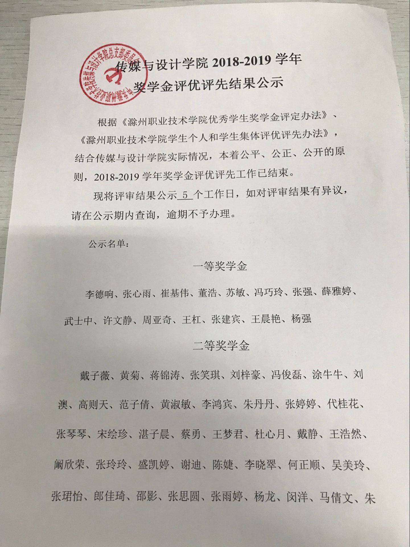 传媒与设计2018—019学年奖学金评优评先结果公示