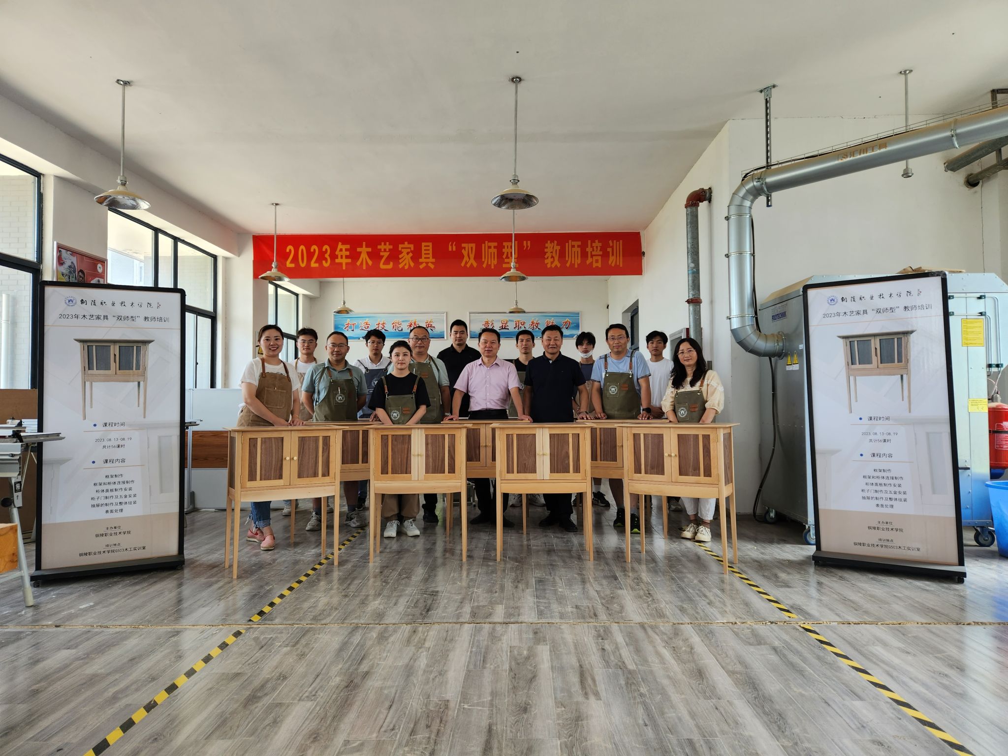 为落实《中共中央国务院关于全面深化新时代教师队伍建设改革的意见》等文件要求,加快推进职业教育艺术类专业“双师型”教师队伍建设, 提升教师徽州传统建筑装饰木艺制作技艺, 传媒与设计学院院长闻建强和教师曹明于8月13日至19日在铜陵参加了铜陵职业技术学院举办的2023年暑期木艺家具“双师型”教师培训。