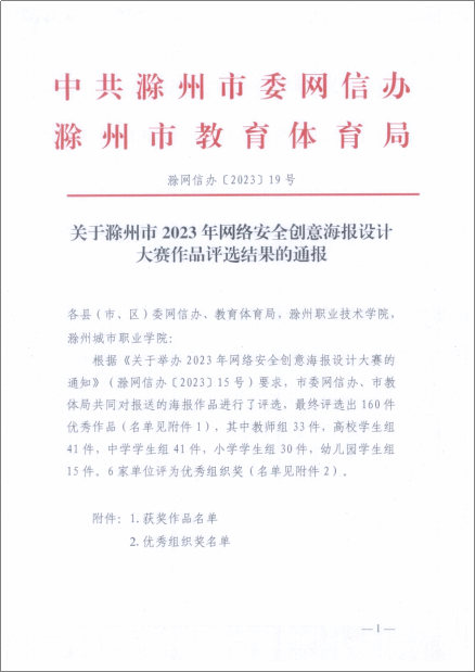 近日,滁州市委网信办、市教体局联合组织的2023年网络安全创意海报设计大赛作品评选结果公布,365官网师生争创佳绩,陈潇潇、阚迪、朱睿三位指导教师带领同学们斩获一等奖两项、二等奖两项。