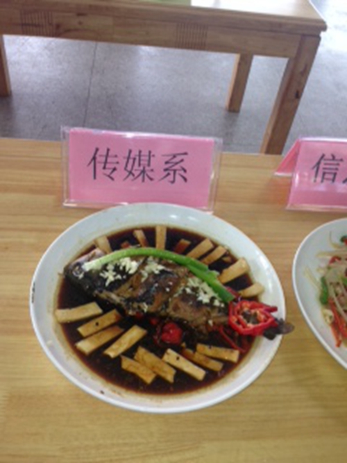 此次大赛由传媒工程系的蔡忠弟老师带领尹磊和康恒两位同学共同参赛完成的,康恒同学在“你问我答”答题中五题全部答对,最终获得五样食材,后由蔡忠弟老师掌勺,最终做出菜品为“如鱼得水”,获得后勤公司评委和团委领导评委的一致好评!真正做到了色香味俱全。