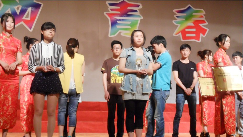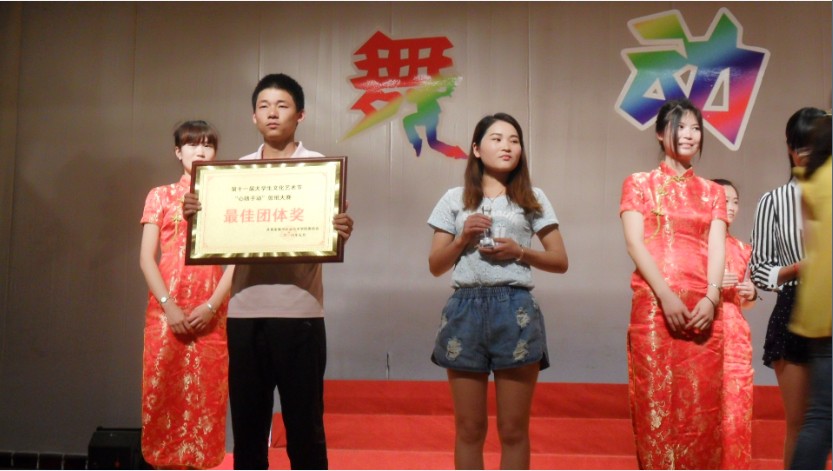 在校园文化艺术节的颁奖环节中,传媒系获得“心随手动”剪纸大赛最佳团体奖以及一等奖,并上台领奖。