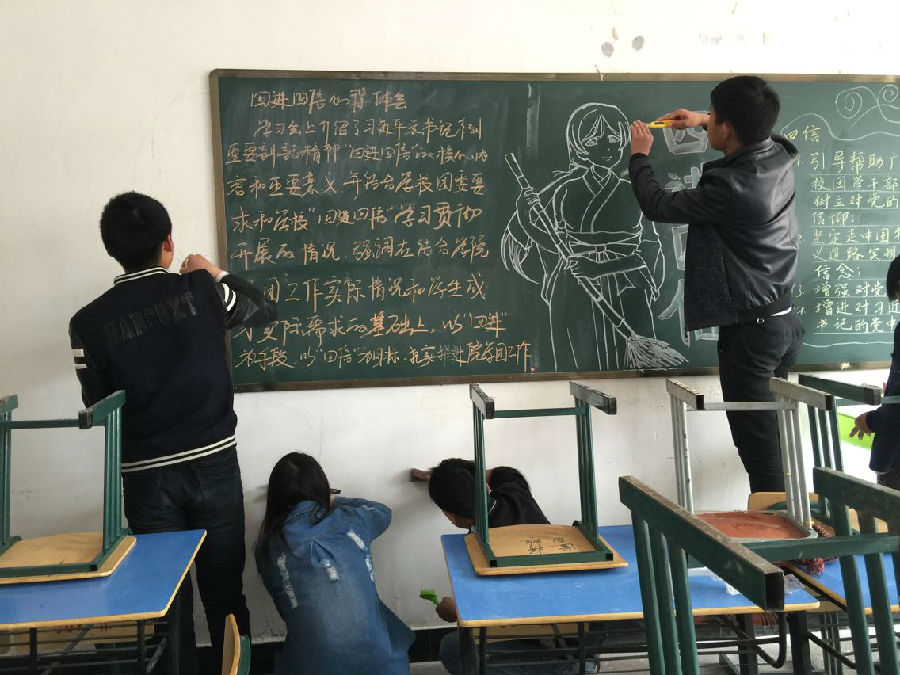 本次修补工作由团总支白书记带领多位学生干部共同完成,为使最终粉刷墙壁的效果统一,我系学生发散思维,用更廉价的水粉颜料进行修补工作;并用砂纸铁丝球等工具将墙面污迹进行打磨清洁,有条不紊的对所有教室进行了粉刷,最终将所有教室修补完毕。