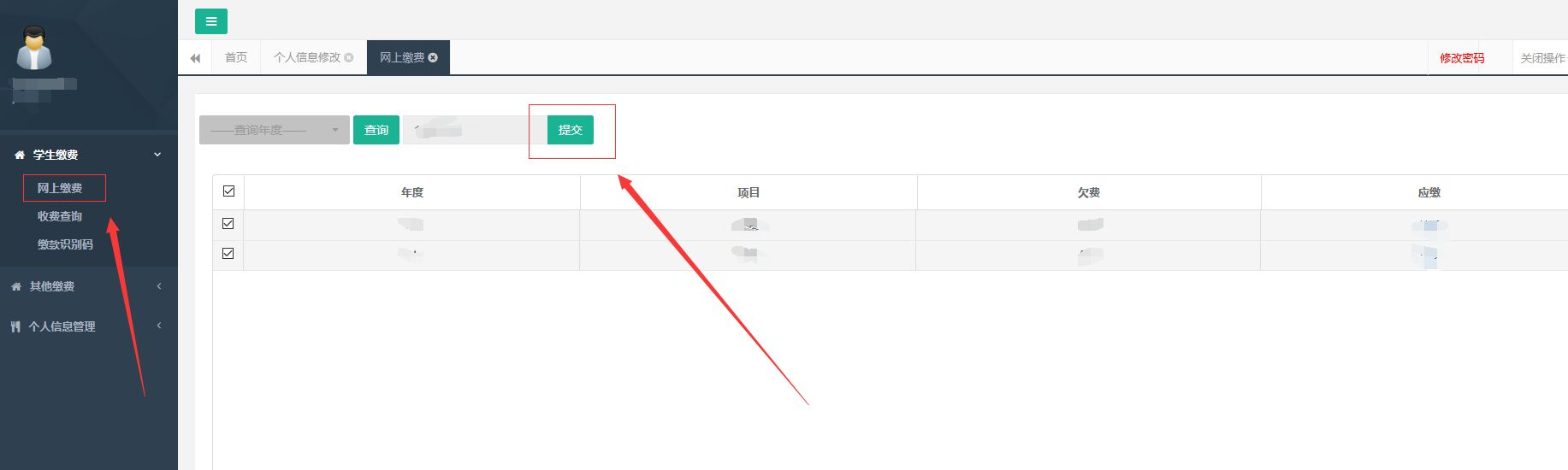 5.点击“学生缴费—网上缴费”,自动跳出应缴纳费用明细,可根据需要勾选需要缴费的项目,选中后点击提交并确定。如图1-7、图1-8: