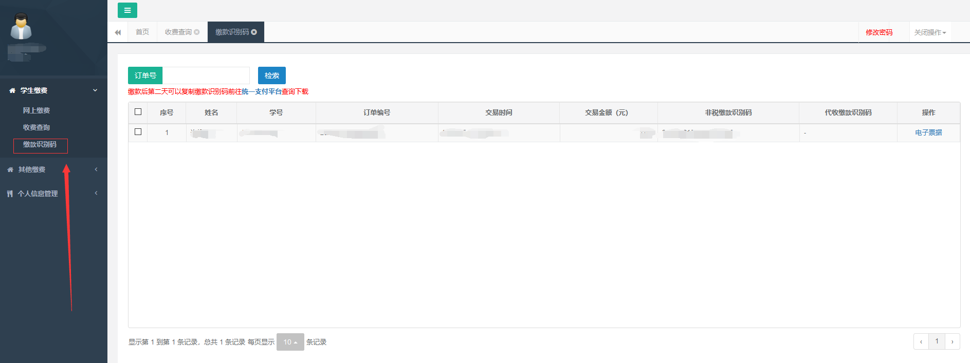 7.缴费完成后,第二天点击“学生缴费—缴款识别码”,可查看电子票据。(如有延迟,请耐心等待)。根据财政票据电子化工作进度,目前仅可自动生成财政非税电子票据,其他需生成财政往来电子票据,缴费两三天后会收到手机短信提示(有两三天延迟,请耐心等待),学生根据手机短信提示,登录财政往来票据平台进行查询,如手机未收到短信提示,可于开学后到学校计财处进行查询。