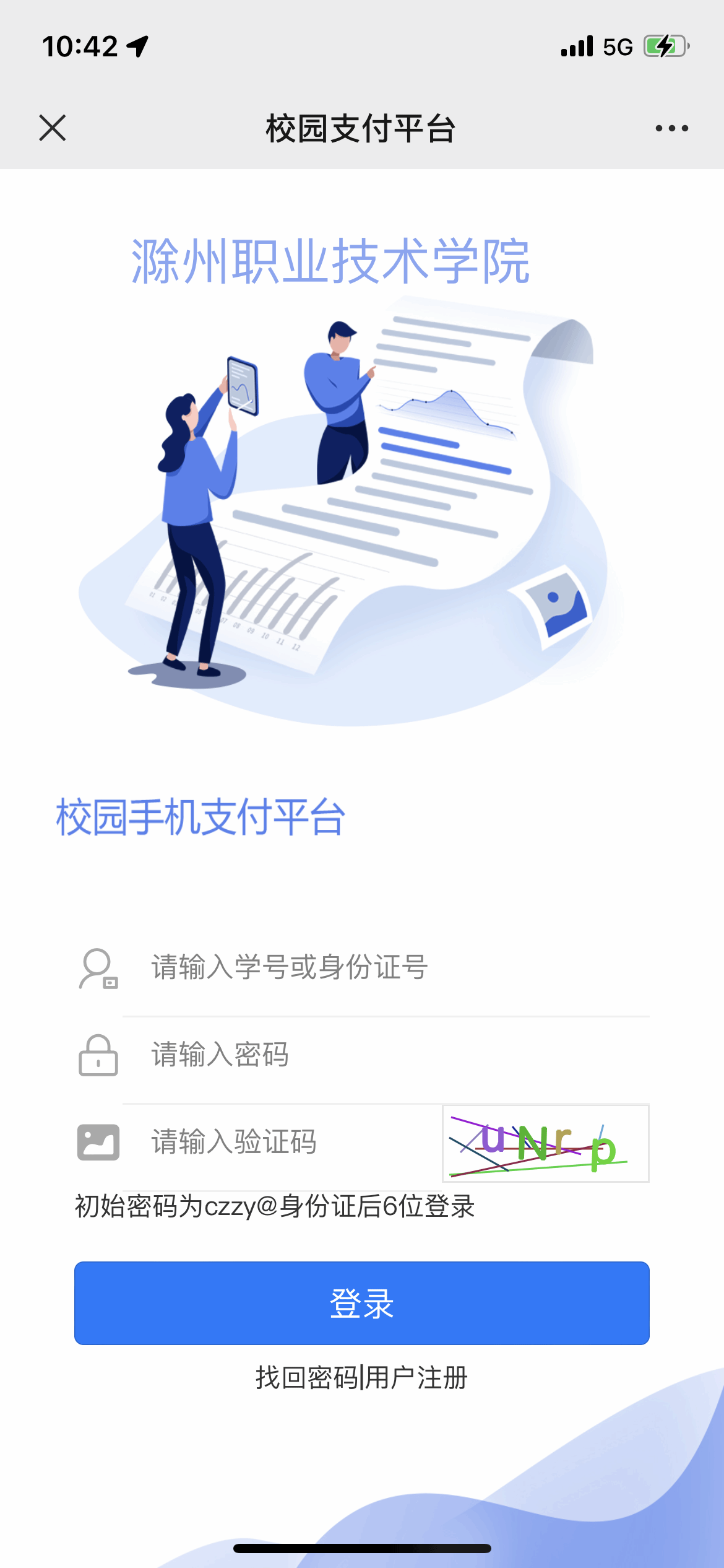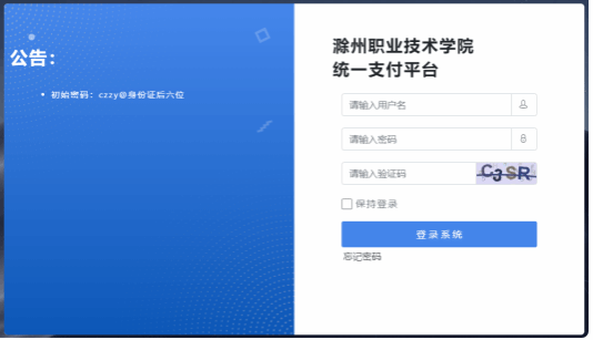 二.进入“网上缴费”页面,新生账号为身份证号,老生账号为学号或者身份证号码,初始密码均为czzy@身份证后六位,身份证带有X的,输入大写X。输入验证码后,点击登录,进入个人页面。如图1-6(电脑版)、图1-7(手机版):
