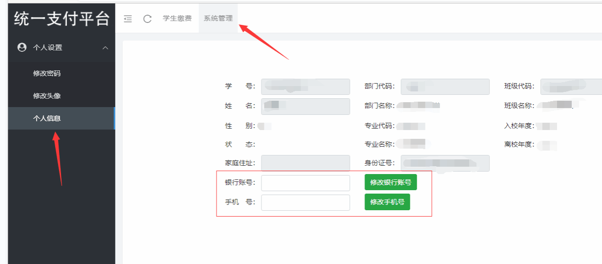 三.电脑端点击“系统管理-个人信息”点击“个人—个人信息”,请仔细核对个人信息,补充修改个人手机号码、银行卡号等信息(如需修改)。如图1-10(电脑端)、1-11(手机端):