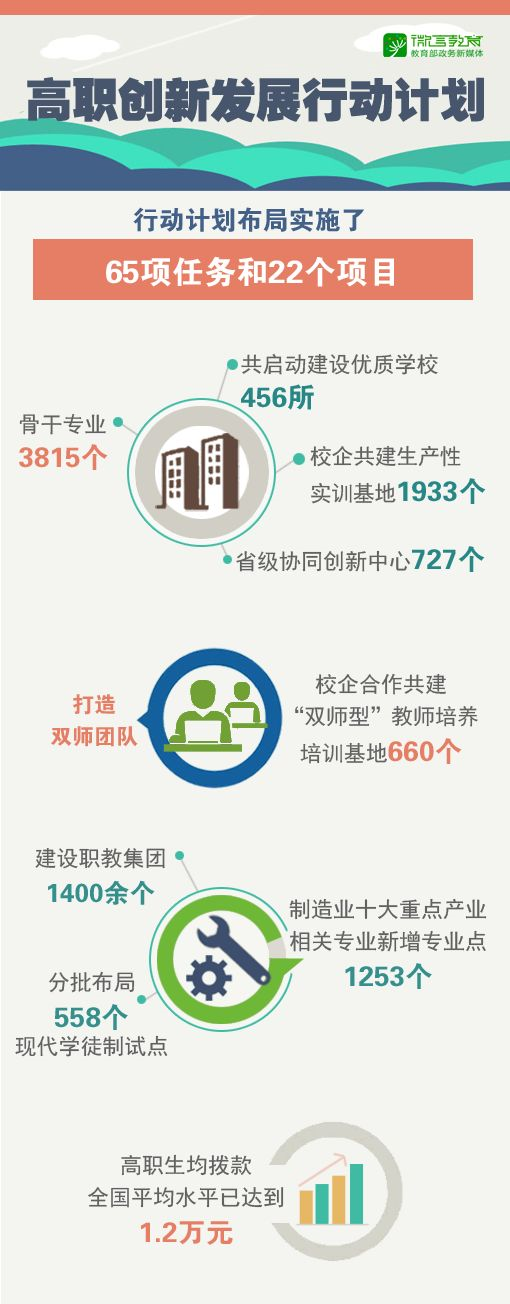 为贯彻全国职业教育工作会议精神和《国务院关于加快发展现代职业教育的决定》,2015年教育部启动实施《高等职业教育创新发展行动计划(2015—2018年)》和《职业院校管理水平提升行动计划(2015—2018年)》。两个行动计划,在设计上一个重在以改革创新引领发展,一个重在以规范管理保障发展。如今,两个行动计划即将收官,到底有啥成效?必须要了解!