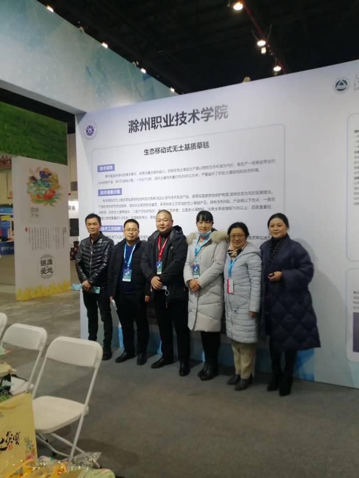 365官网科技处肖陆飞老师,食品与环境工程学院园林系主任江生泉和姜自红老师,食品系主任陈静老师和清爽葡萄种植合作社负责人、食品与环境工程学院外聘教师胡立虎参加了本次活动。其中食品与环境工程学院园林系江生泉老师的“生态移动式无土基质草毯研究与应用技术”参加了高校技术成果展。食品与环境工程学院校企合作企业清爽葡萄种植合作社携带了系列产品参加展销。