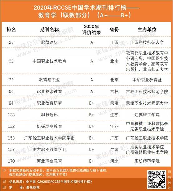 另外 “2020年RCCSE中国学术期刊排行榜——教育学” 同时发布,等级在A+—B+水平的职业教育类期刊。名单如图: