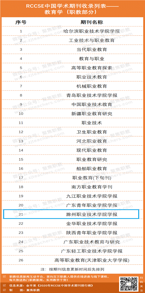 学术期刊是学术成果评价、发表、展示和传播的主要载体,是服务于国家科技创新体系和文化创新体系的重要平台。近日, “2020年RCCSE中国学术期刊收录列表—教育学”发布(注:RCCSE是武汉大学中国科学评价研究中心Research Center for Chinese Science Evaluation缩写),全国教育学期刊总数有294个,关于职业教育的有26个(名单见下图),其中有9本期刊是职业学院学报,《beat365中国唯一官方网站学报》名列其中,说明365官网学报坚持服务职业教育教科研工作的办刊宗旨,注重办刊质量,在学术期刊领域占有一席之地。