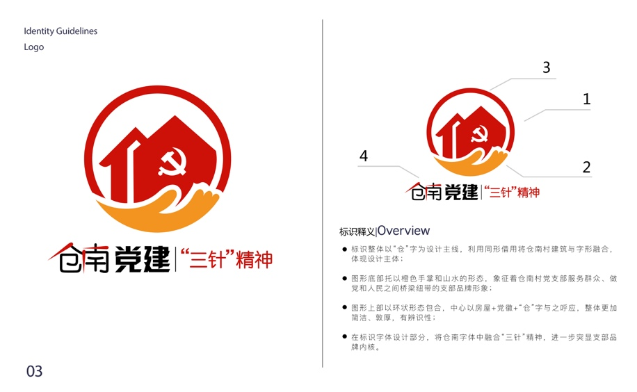 传媒与设计学院依托互联网+城乡创意发展中心平台,深耕地域文化,挖掘特色内核,联合科技处积极主动对接服务帮扶乡村,通过实地调研、线上交流以及会议研讨等多种方式充分沟通,结合仓南村实际,以“三针精神”为主线,为该村党支部党建品牌建设量身定制设计方案,形成了一套完整的“三针精神”党建标识,其中包括VI形象设计、生活应用品、工作场地标识及工作用品等共计4套系统,充分体现了仓南村党支部全体党员干部像一根银针一样担当起党和人民之间的桥梁纽带;像钢针一样用钢一般的毅力不怕吃苦、顽强拼搏,坚守全心全意为人民服务的宗旨;像绣花针一样,一针一线,耐心细致的做实事、做好事、做成事,争当群众贴心人的党建主旨。该标识标识整体以“仓”字为设计主线,利用同形借用将仓南村建筑与字形融合,体现设计主体;图形底部托以橙色手掌和山水的形态,象征着仓南村党支部服务群众、做党和人民之间桥梁纽带的支部品牌形象;图形上部以环状形态包合,中心以房屋+党徽+“仓”字与之呼应,整体更加简洁、敦厚,有辨识性;在标识字体设计部分,将仓南字体中融合“三针”精神,进一步突显支部品牌内核。整套设计形象鲜明突出、清晰易懂,广大村民对村党支部有了更为深刻的认知,树立了良好的形象,彰显了高校人才与科技在乡村振兴中的独特作用和实际价值。