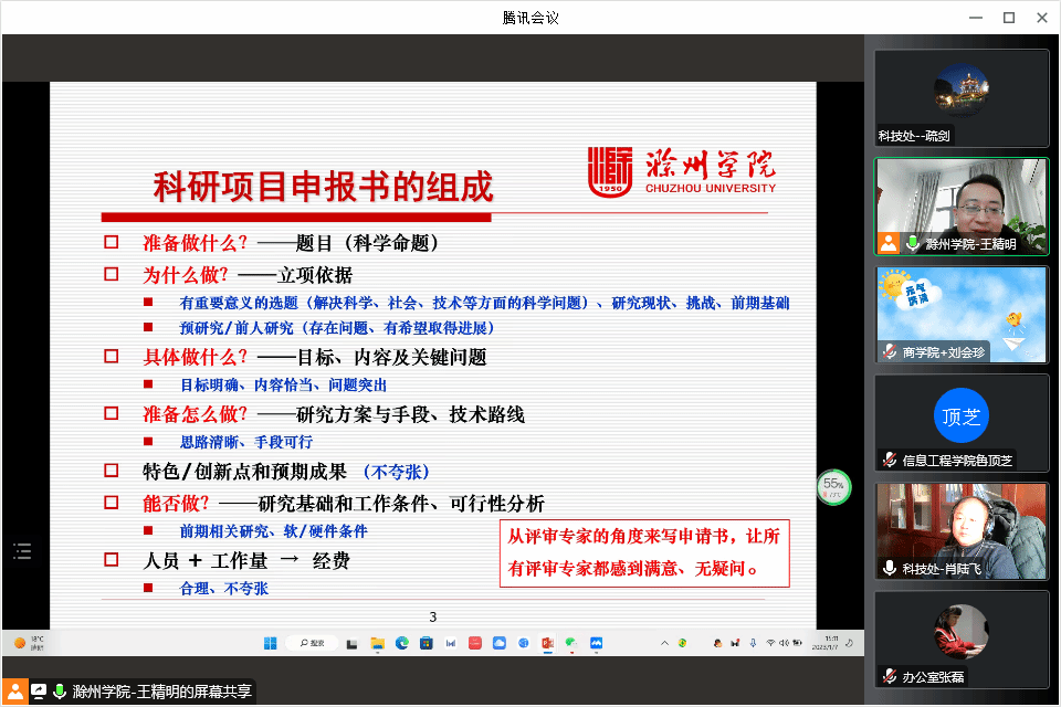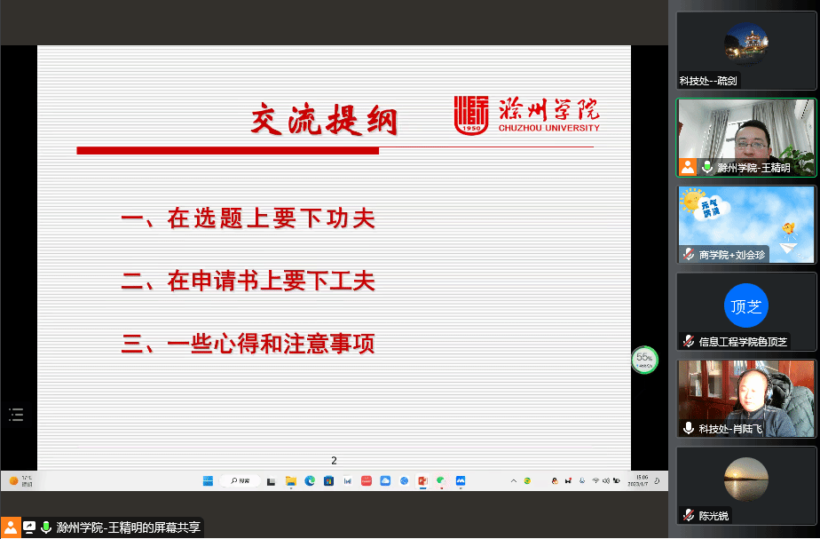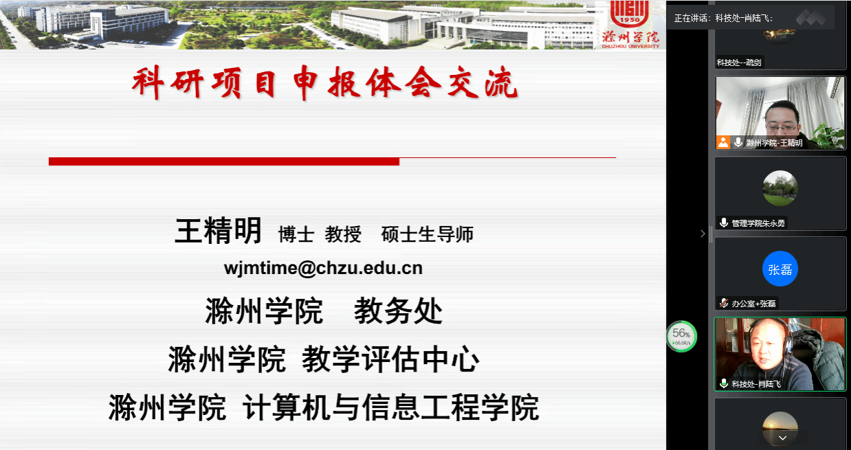 根据学校统一安排,科技处于2023年1月7日组织开展“科研项目申报体会交流”线上会议。本次培训会议由365官网科技处处长肖陆飞主持,培训邀请了滁州学院教学评估中心主任兼教务处副处长王精明教授主讲。365官网从事科研工作的教职员工参加了本次线上交流会。