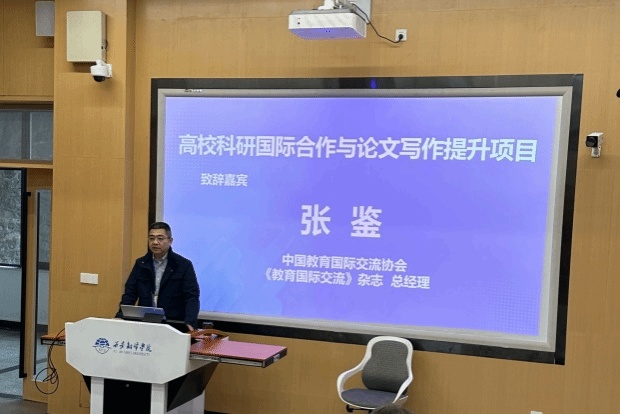 11月14日-18日,由中国教育国际交流协会主办,中国教育国际交流研修学院和西安翻译学院承办的“高校科研国际合作与论文写作能力提升”项目在西安翻译学院继续教育学院成功举办。此次项目旨在为高校从事国际合作或科学研究人员在国际性期刊上发表论文提供学术支持。中国教育国际交流协会《教育国际交流》杂志总经理张鉴出席开班仪式并致辞,来自全国三十余所高校的科研骨干教师参加了培训。